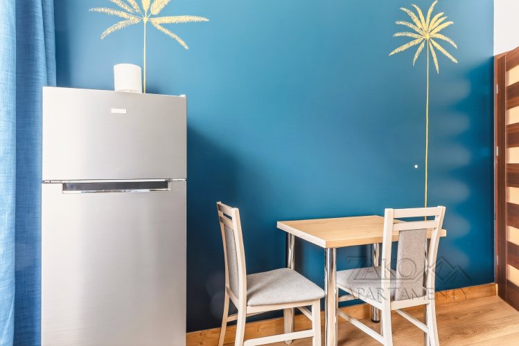 płyta elektryczna, czajnik elektryczny, zmywarka, lodówka, mikrofalówka, garnki, naczynia, sztućce, szkło, stół rozkładany, 4 x krzesła